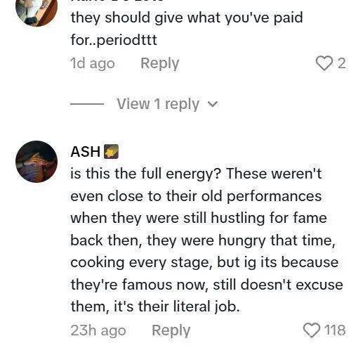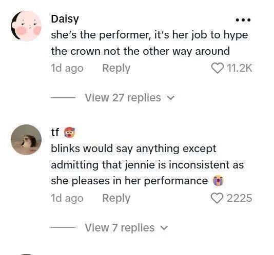 这段视频迅速获得20.8万点赞和超过200万次观看,但评论区俨然成了“辩论场”。许多网友直言不讳:“观众付费看演出,调动气氛本是艺人的职责,怎能反过来要求粉丝负责?”更有评论指出,即便在所谓“状态佳”的表演中,JENNIE的表现仍远未达到其过往水准,并质疑:“组合登台时似乎已失去对舞台的渴望。”